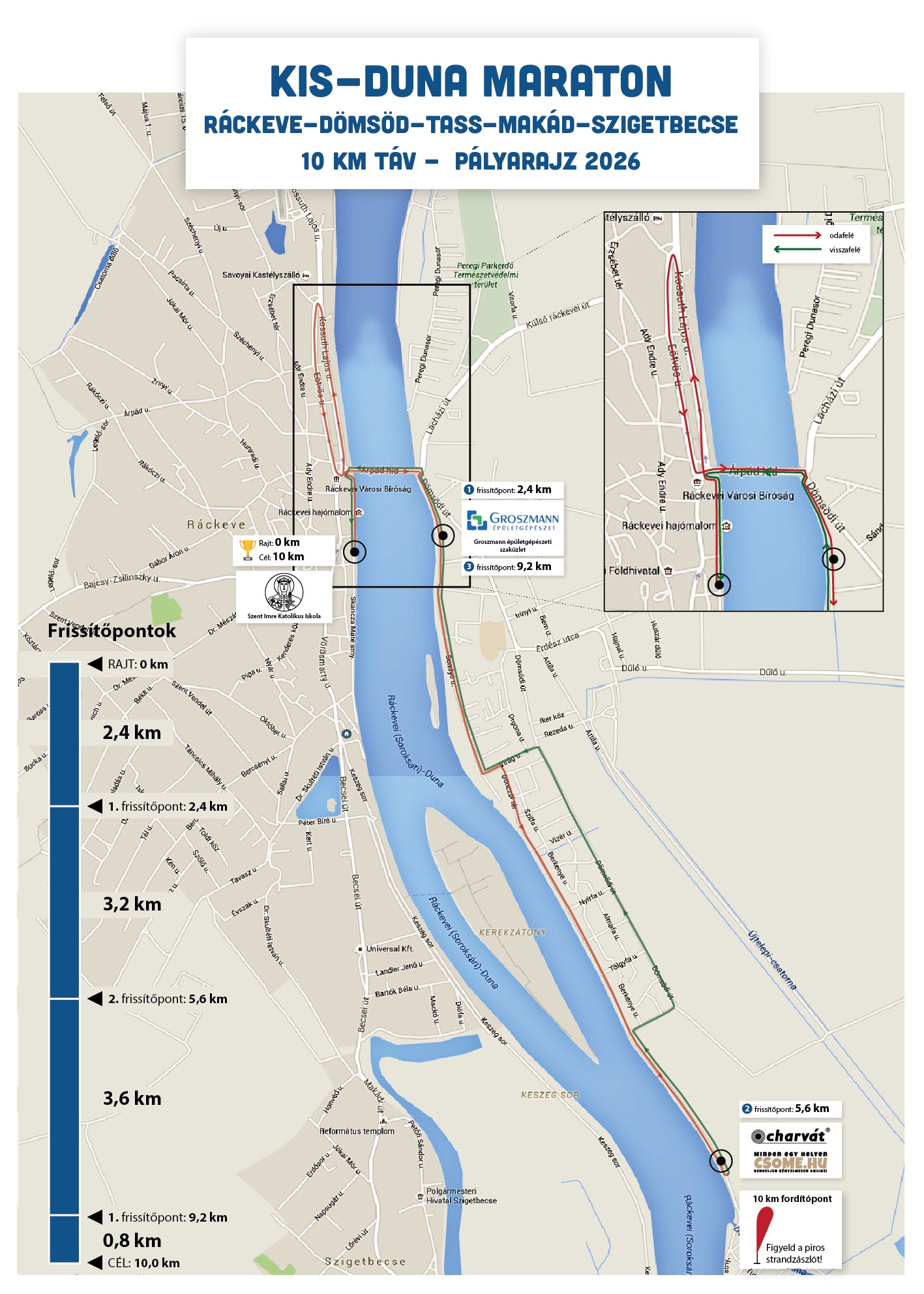 A 10 kilométeres távon a fordító 5,6 km-nél található. A második frissítőpont után az úton elhelyezett nagy strandzászló jelzi a tízesek fordulóját. Visszafelé a mezőny kis kitérőt tesz, hogy a gyorsabb futók, ne ütközzenek a lassabban érkezőkkel. Segítőink jelzik a haladási irányt.
