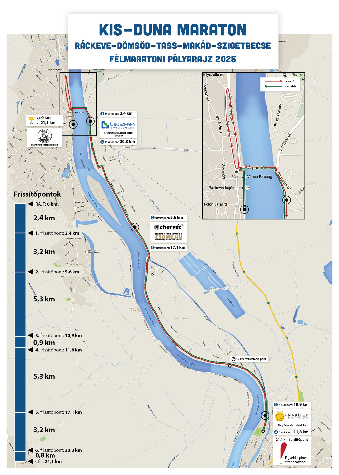 A félmaraton fordítója Dömsödön lesz, 11,4 km-nél. A félmaratoni mezőny a fordulás után végig ugyanazon az úton jön vissza, mint ahogy ment, kivéve a belvárosi kört, amit nem kell újra megfutni. Visszafelé így rövidebb az út, ezért nem pont féltávnál találhatók a fordítók.