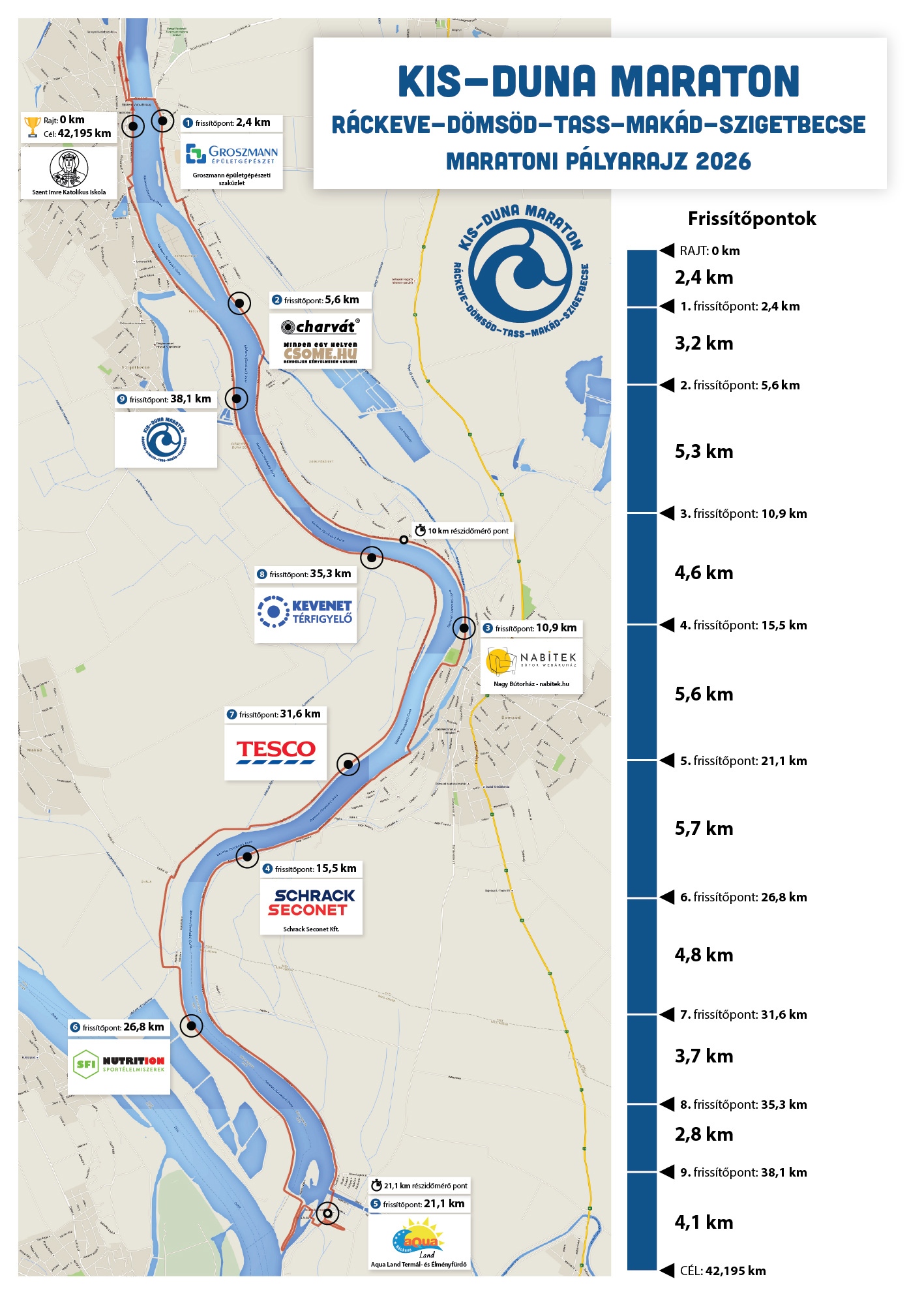 A maratoni pálya első szakasza megegyezik a rövidebb távokéval. A 42 kilométer viszont egy nagy kör lesz a Kis-Duna mentén. A Ráckeve belvárosi bevezető szakasz után a hídon átkelve dél felé fordul a mezőny. Végig a Duna parton elfutnak Dömsödig (itt fordul a félmaraton mezőnye) majd tovább egészen a Tassi-zsilipig. A zsilipen keskeny gyaloghíd vezet át. A zsilipen átkelve átfutunk az újjonnan épített vízerőmű fölött majd rögtön délre fordulunk és egy füves ösvényen kimegyünk egészen a Csepel-sziget csücskéig. A szigetcsúcsnál egy szobor a fordító. Itt rajtszám ellenőrzést is végzünk. Ugyanazon az ösvényen futunk vissza a vízerőmű felé, amin jöttünk. Visszatérve a gáthoz, a töltéskoronán északi irányba fordul a mezőny és elindul Ráckeve felé. Visszafelé végig a gát vonalát kell követni (rajta, vagy mellette). A cél megegyezik a rajt helyszínével csak a maratonon indulók dél felől, míg a rövidebb távon versenyzők északi irányból közelítik meg.